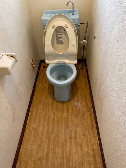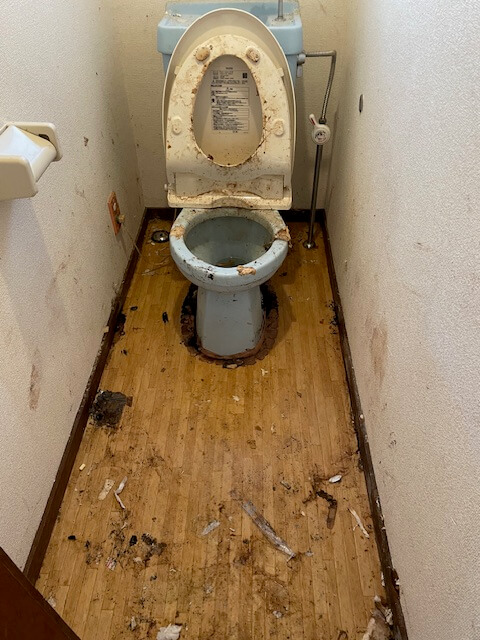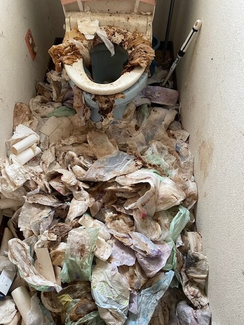 水回りはかなり汚れが蓄積されていてトイレは床や便器に汚物が付着、トイレットペーパーが詰まって水が流れない状態に…。