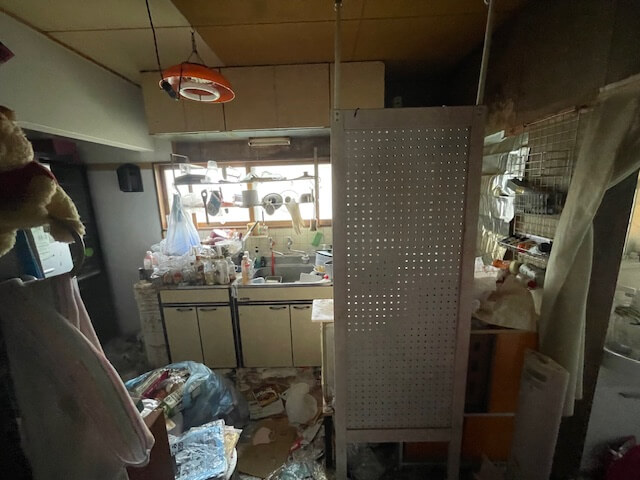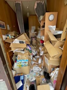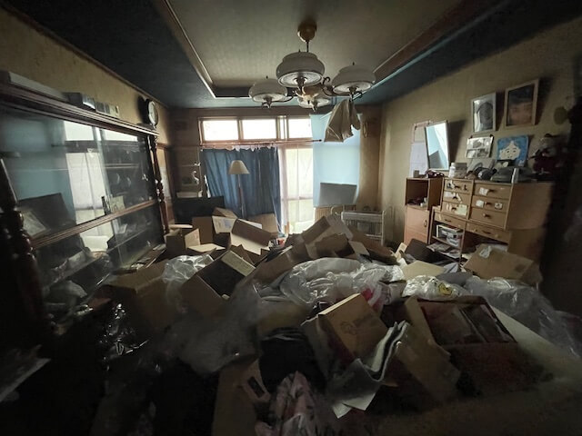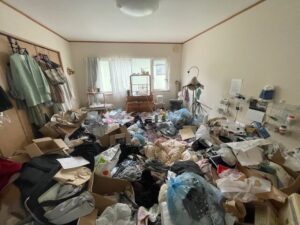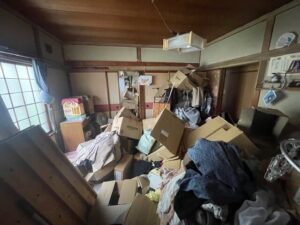 居間と和室にも段ボールや衣類、食料品のプラスチックゴミなどが散乱しており、不衛生な環境でした。